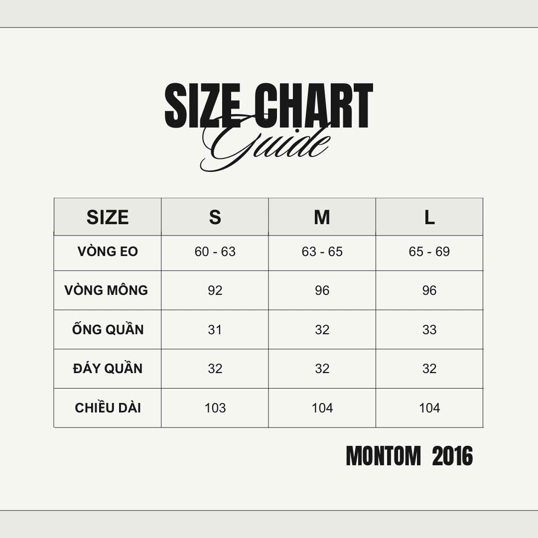 S | (⚖️ Cân nặng) 40 – 47kg | (📏 Vòng eo) 60 – 63 cm | (👖 Ống quần) 31 cm | (⬇️ Đáy quần) 32 cm | (📐 Chiều dài) 103 cm
